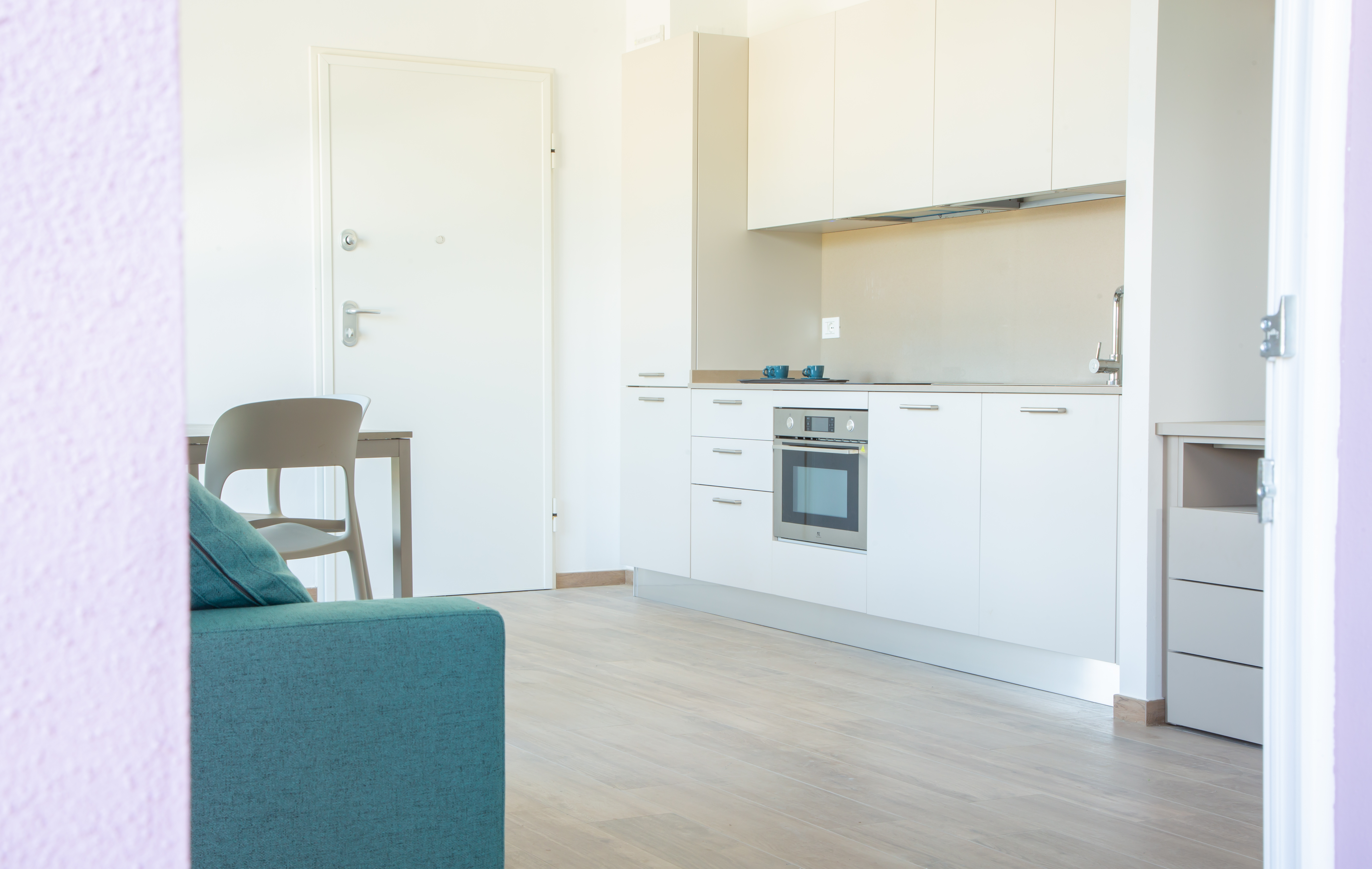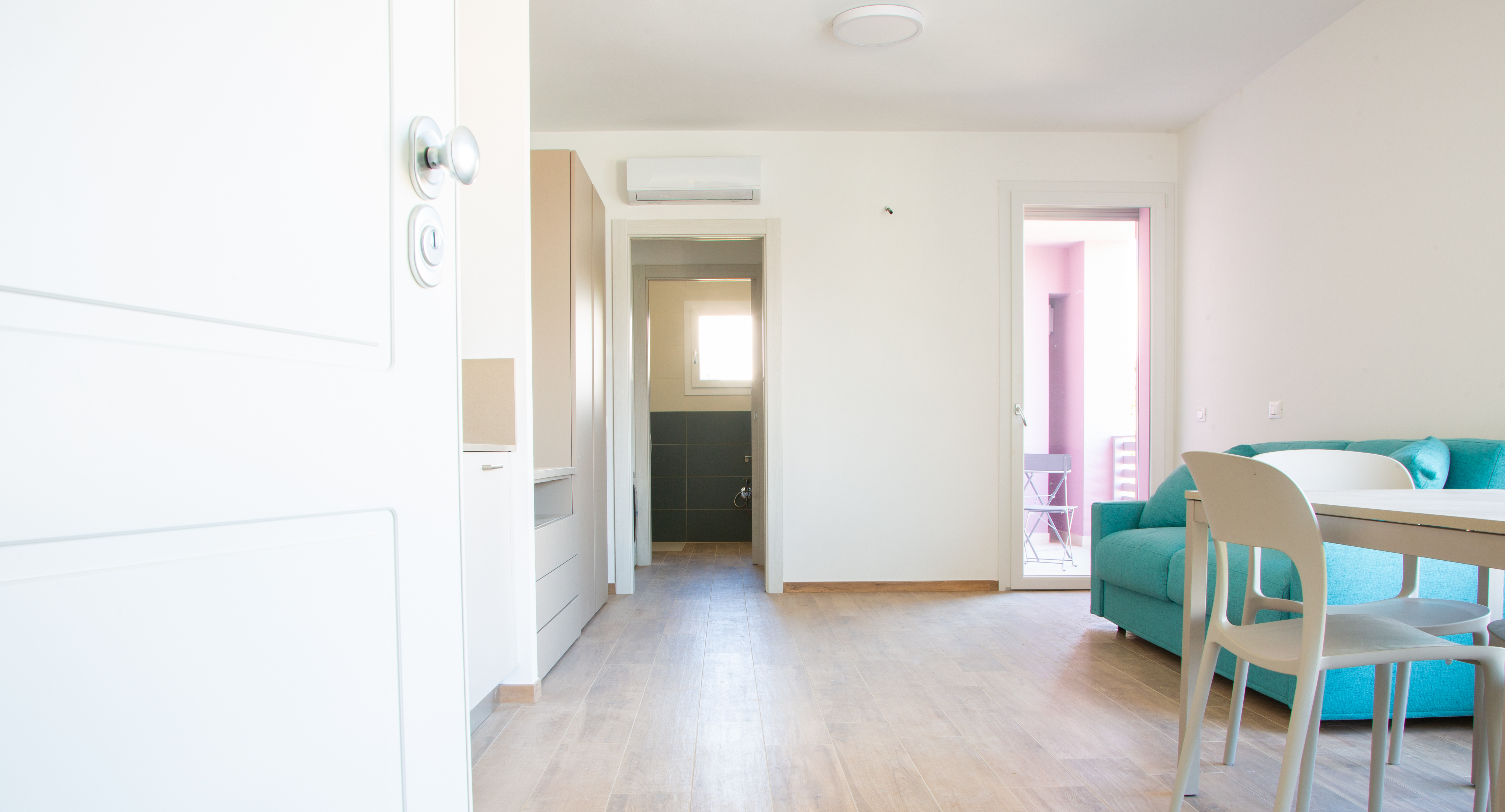 L’unità abitativa 02 (posta al primo piano), classificata monolocale, è costituita da: soggiorno-pranzo-notte in un unico locale, antibagno, bagno finestrato e 2 logge esposte a Sud.